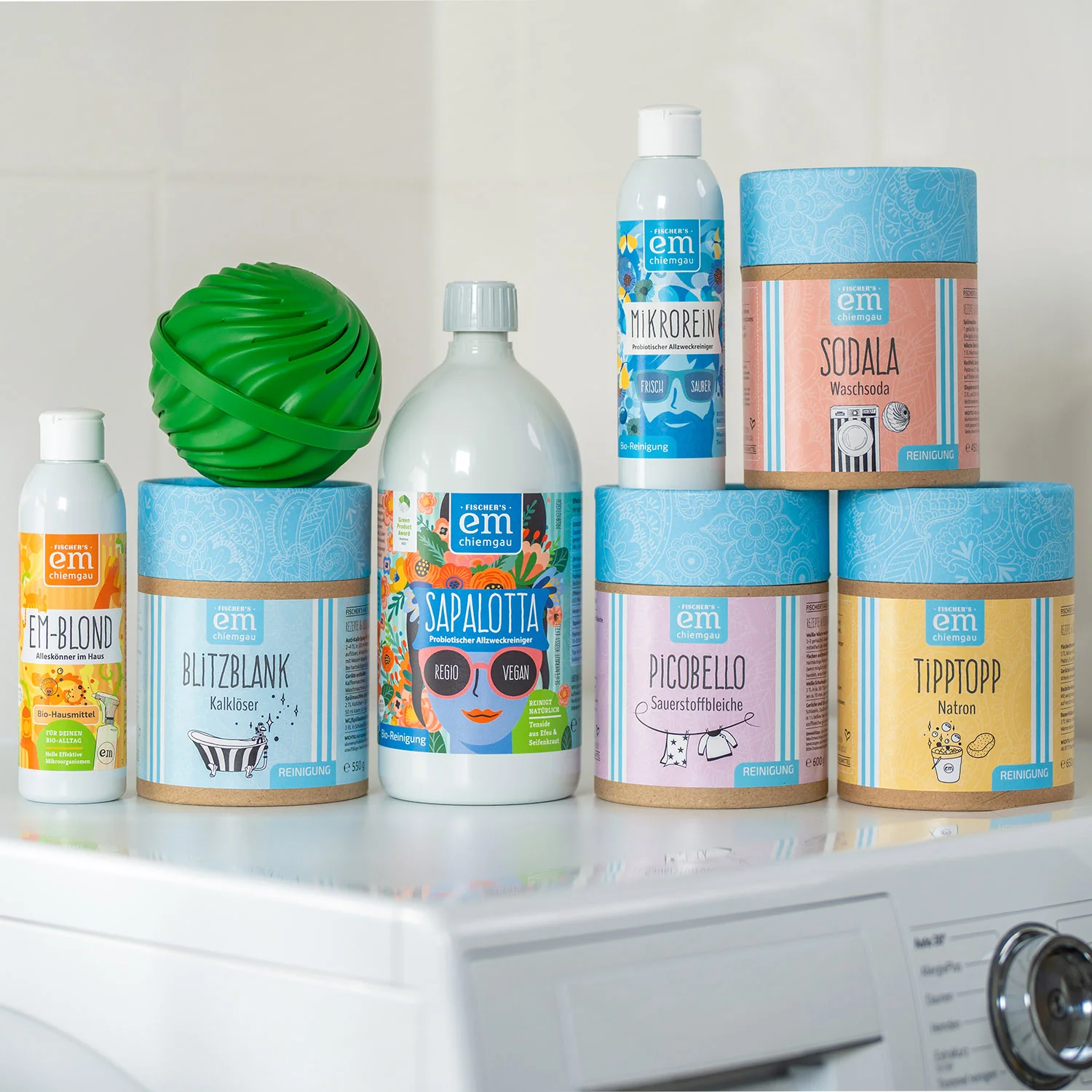 Gib bei Bedarf ca. 20 ml EM-Mikrorein oder Sapalotta oder EM-blond direkt zum Waschgang hinzu – ideal bei stark riechender Wäsche oder für ein extra frisches Gefühl. Auch eine Vorwäsche mit EM ist wirksam und reinigt die Wäsche vor.