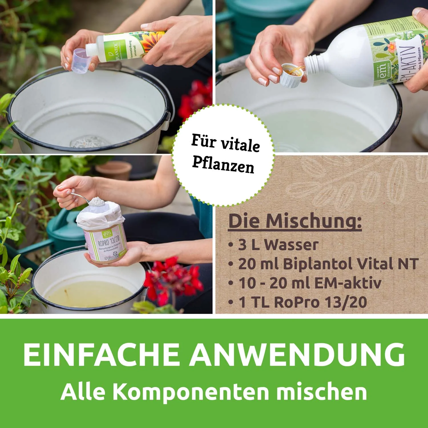Die Produkte finden aber nicht nur in Kombination als EM-Tauchbad Anwendung. Auch einzeln für sich sind die Komponenten eine echte Bereicherung für deinen Garten!